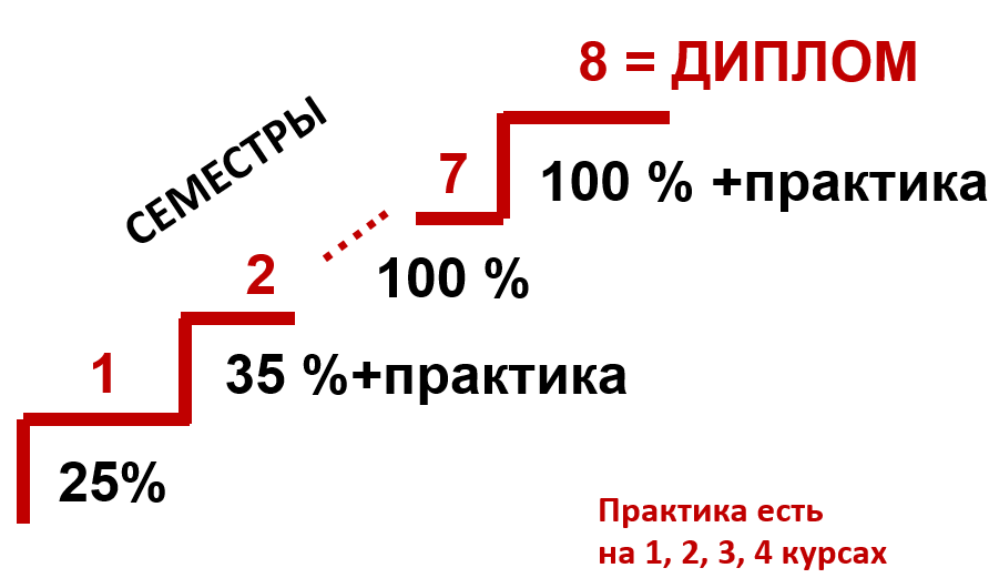 Бакалавриат по аддитивным технологиям рассчитан на 4 года обучения (8 семестров), специализация начинается с первого курса.
