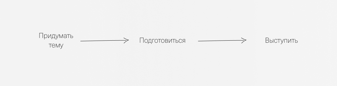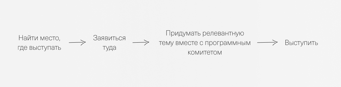 Чтобы схема заработала, нужно начать отслеживать все профильные мероприятия, особенно небольшие или внутренние. Можно писать организаторам самостоятельно, можно найти DevRel-специалиста внутри компании и рассказать ему, что вы хотите выступить, — возможно, он подскажет какие-то новые возможности.