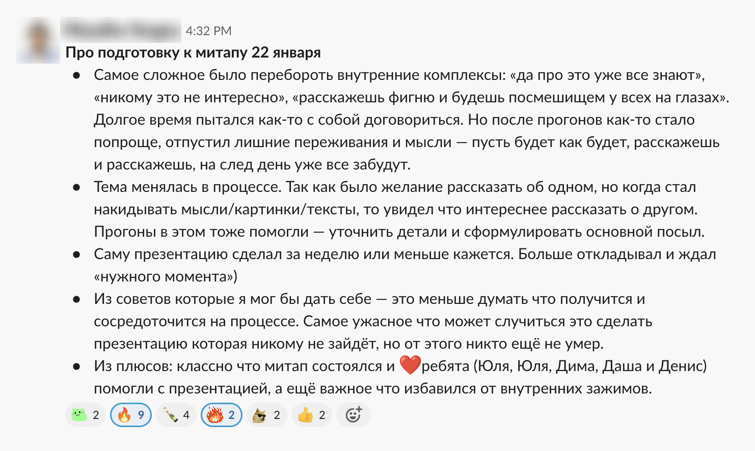 После первого митапа мы попросили ребят рассказать другим дизайнерам, сложно ли было готовиться к выступлению, что им помогло, а что мешало. Теперь это стало нашей традицией, и все докладчики и писатели обязательно рассказывают, что было сложно в процессе. Кажется, это помогает решиться колеблющимся.