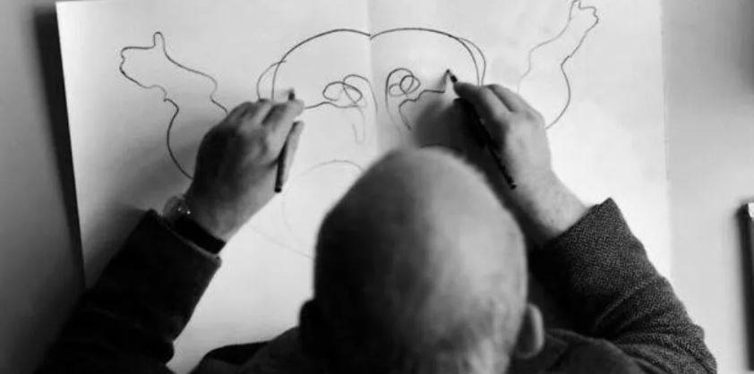 Одна из рук чертит волнистую линию, другая рука — пишет