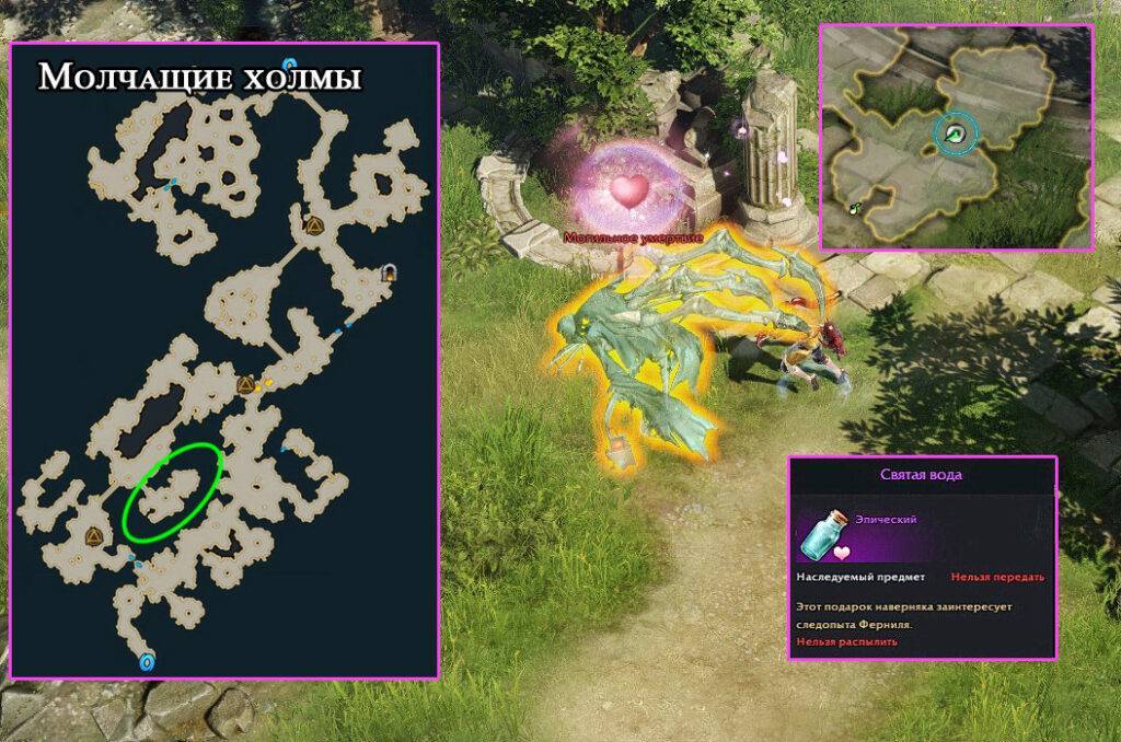 В указанной на картинке области время от времени появляется моб «Могильное умертвие» с сердечком над головой. Умертвие не имеет полоски здоровья и быстро пропадает, если вы не успеете нанести достаточное количество ударов. Словом, ведет себя, как обычный нюхль Отлупите его и заберите фиолетовый подарок «Святая вода».