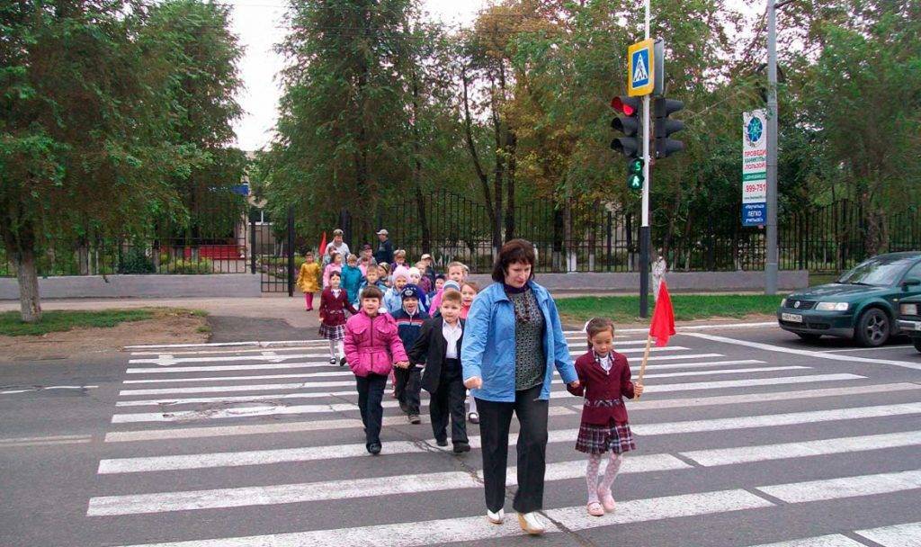 Группы детей разрешается водить только по тротуарам и пешеходным дорожкам. Спереди и сзади колонны, а также с левой стороны должны находиться сопровождающие взрослые с красными флажками.