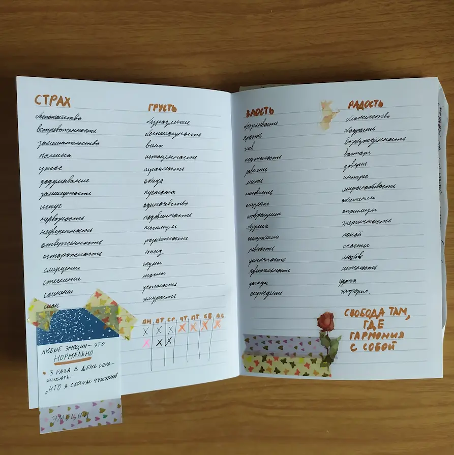 - Выписала в ежедневник все существующие эмоции и чувства, чтобы пытаться точно определить своё состояние.