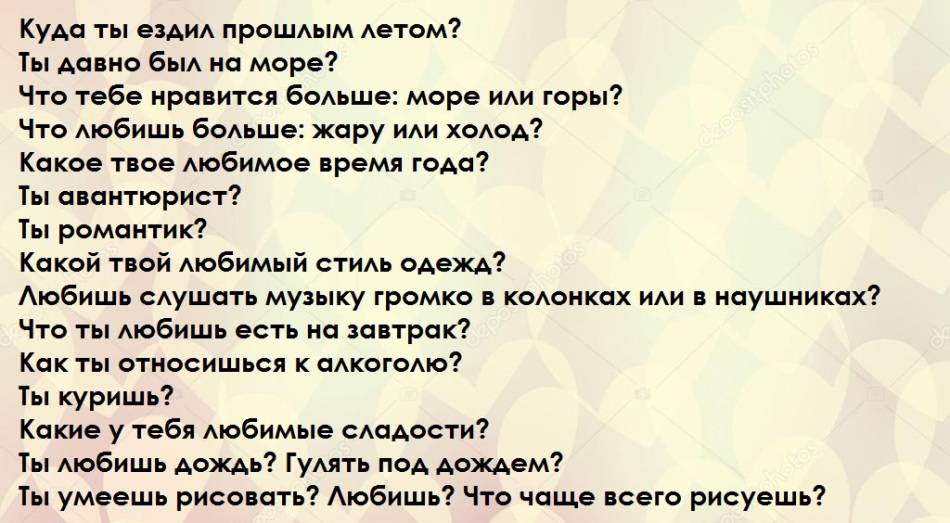 Зная, что спросить у парня, можно избавить друг друга от неловких пауз и бесцельного молчания. А ведь хороший разговор — это прямой способ заполучить симпатию своего собеседника, лучше его изучить и понять, проверить совместимость взглядов. Эти вопросы подойдут для разных ситуаций и отношений — от первоначального знакомства с парнем до серьезного нескольколетнего союза или даже брака. Говорить о важных вещах или о чем-то легком и слегка кокетливом или смешном — выбор уже самой пары.