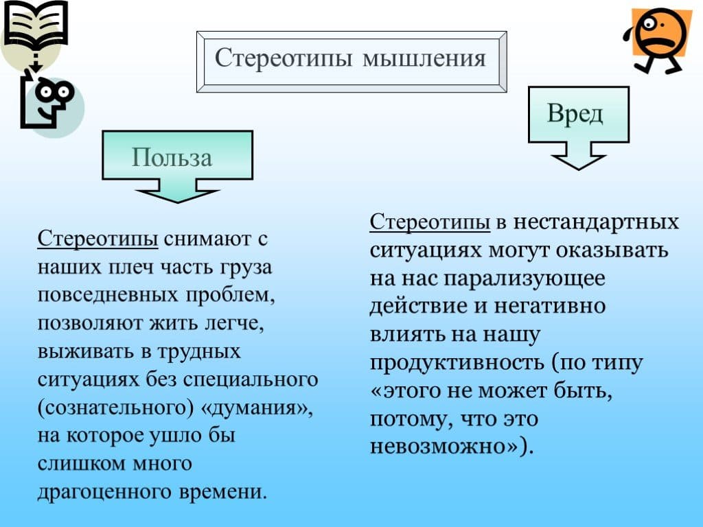 - В-третьих, стереотипы помогают мозгу оптимизировать работу: минимизировать усилия на анализ личности в самом начале общения.