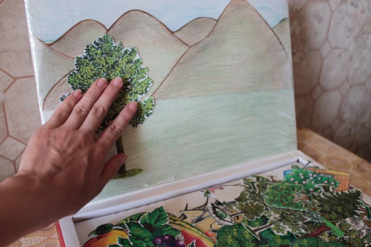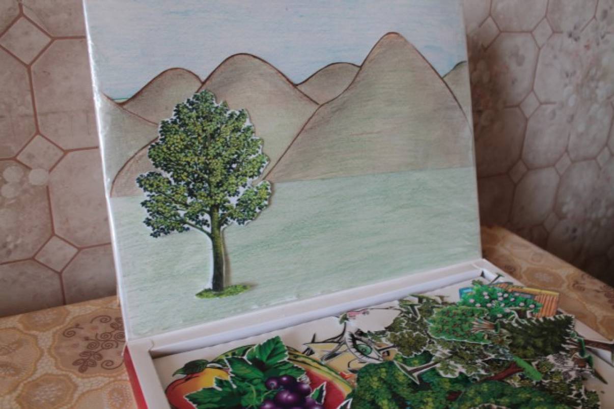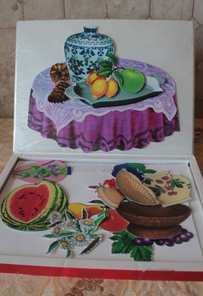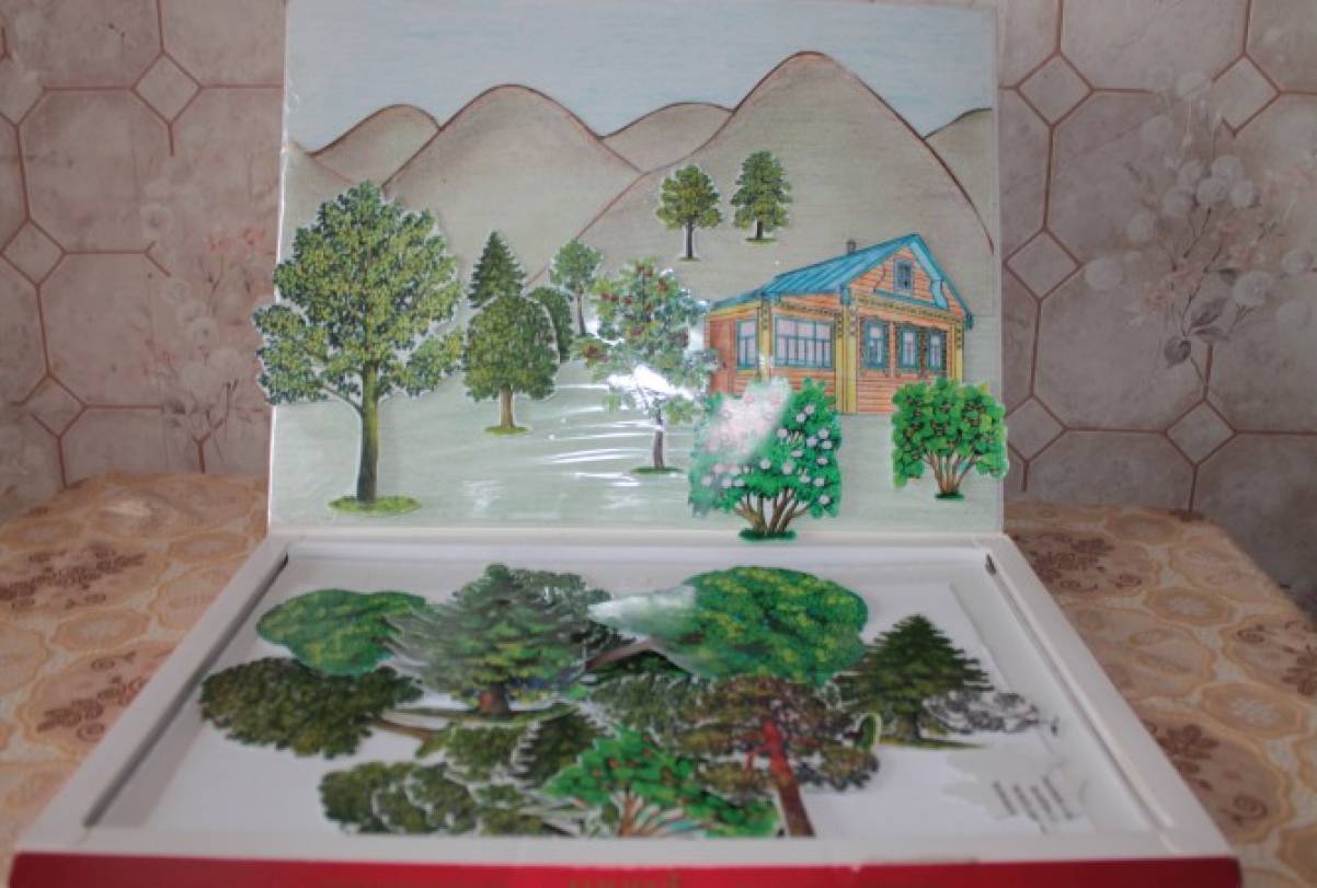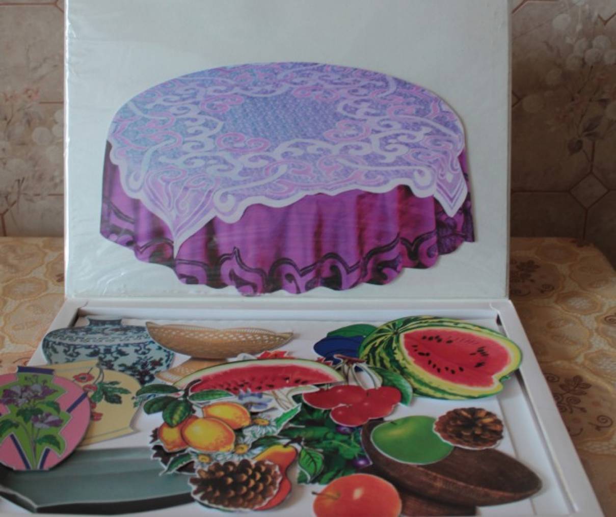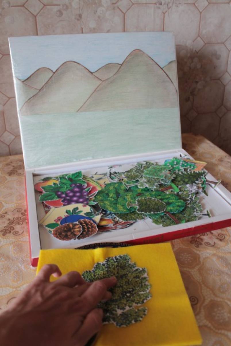 Рабочая поверхность покрыта пленкой-вкладышем, куда можно вставлять крупные элементы пейзажа, натюрморта, портрета и прикреплять более мелкие изображения используя влажную поверхность. А нижняя часть состоит из полости, в которой расположены более мелкие изображенные элементы жанров живописи, с помощью которых реализуются игровые и дидактические задачи данного пособия.
