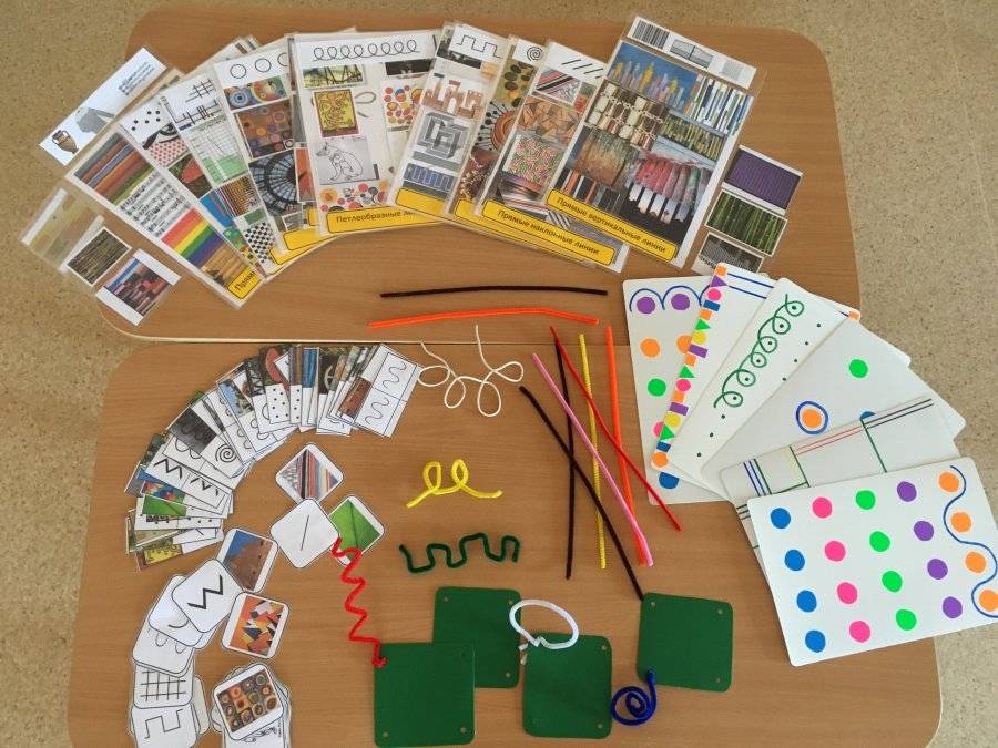 - Продолжи ряд. На бумажных полосках изображены разные изогнутые линии. В начале вдоль этих полосок приклеены геометрические фигурки в определенной последовательности. Задача ребенка — продолжить ряд, используя дополнительные фигуры из коробочки.