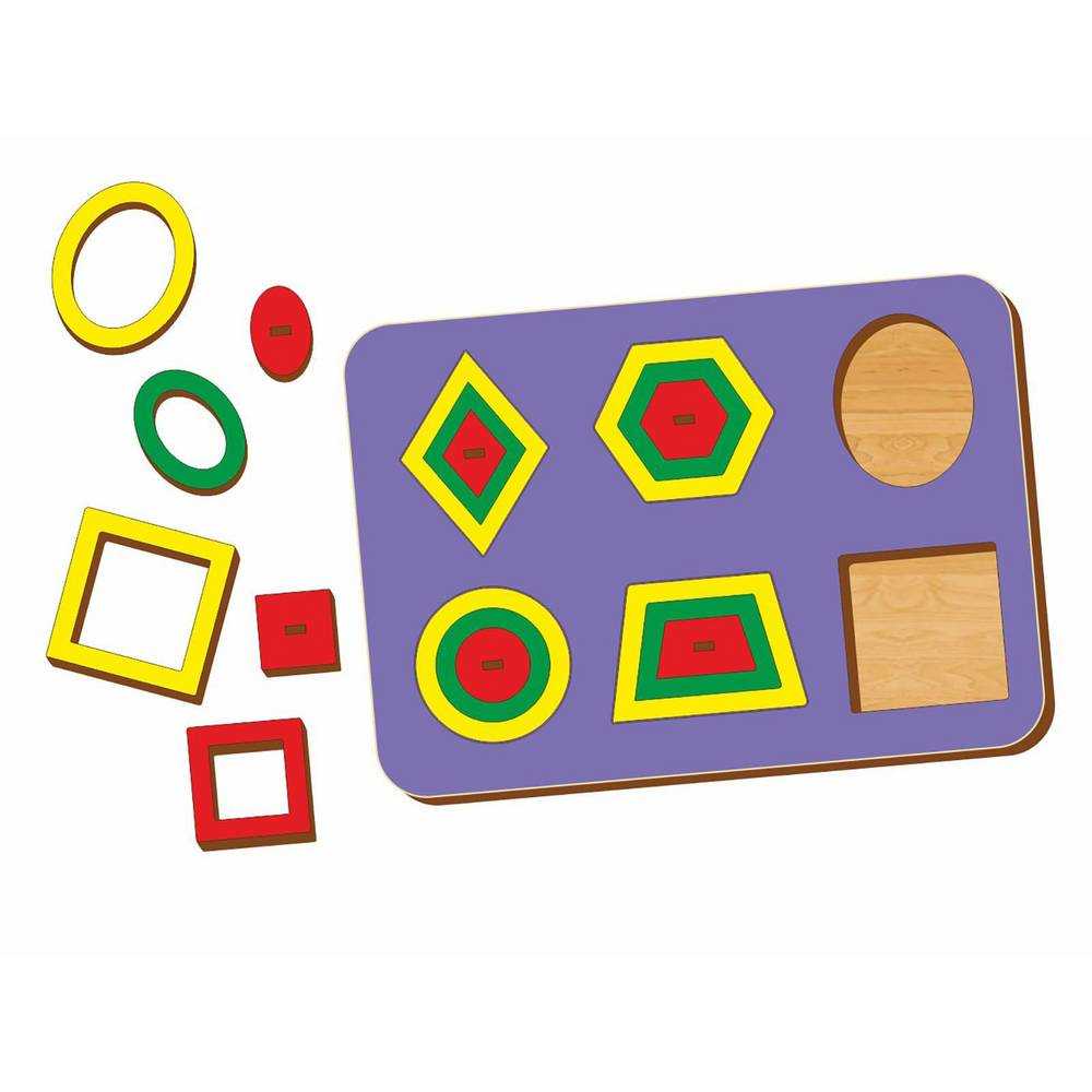 - В картонных листах определенного цвета прорезано несколько разных геометрических отверстий. Также вырезаны геометрические фигуры, соответствующие этим отверстиям по форме и цвету листа. Игровая задача — правильно разложить фигуры по отверстиям.