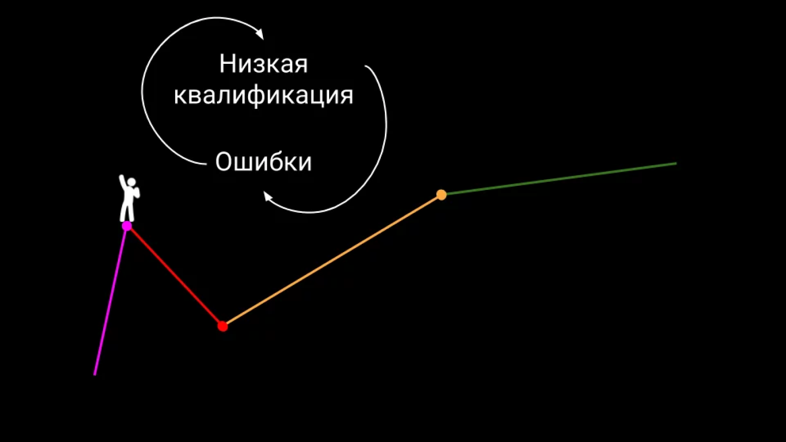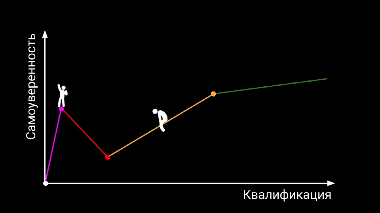 - «Пик глупости» (розовый отрезок) — человек думает, что знает всё. Это тот самый парнишка после недельных курсов.
