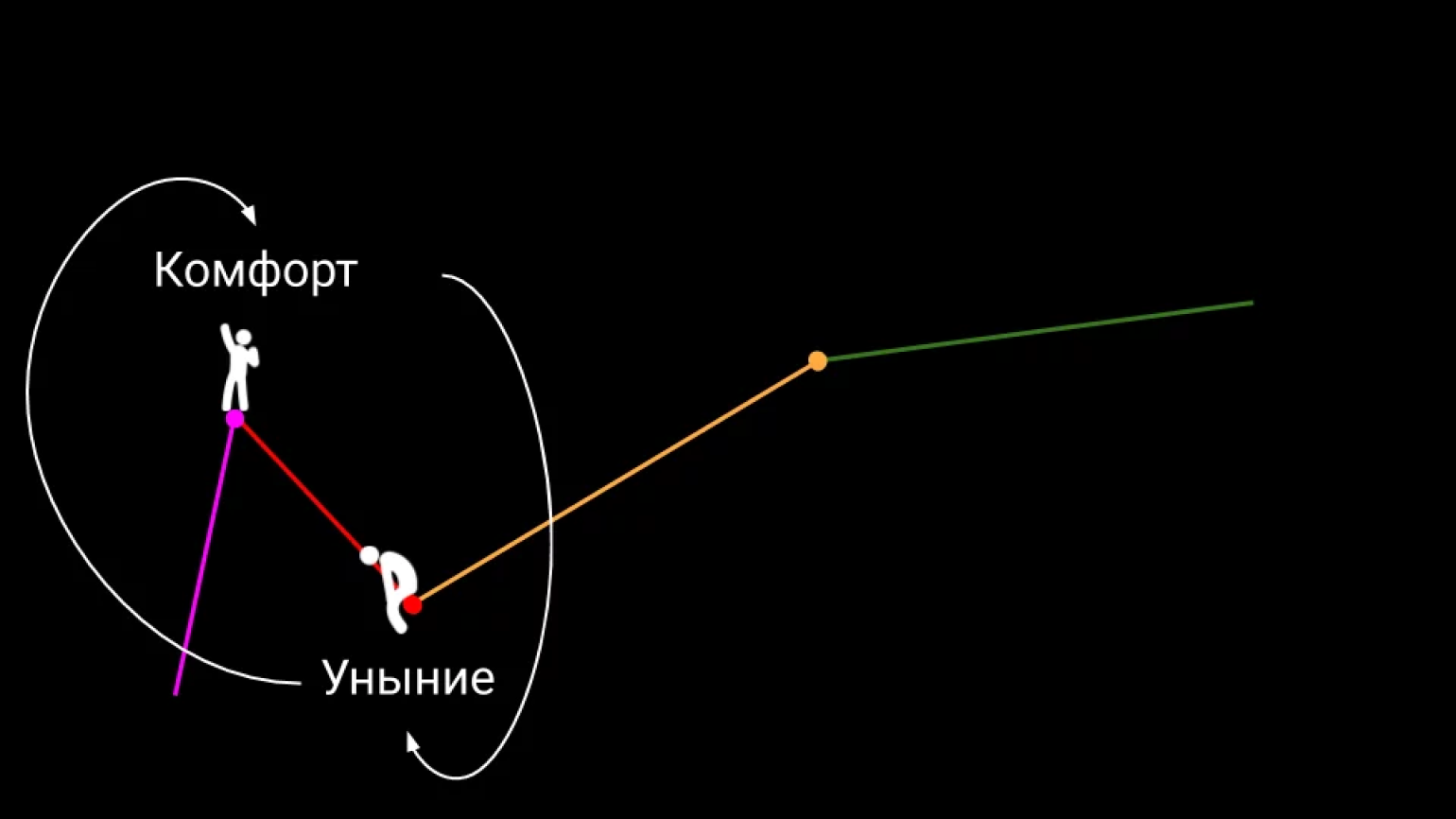 - «Долина отчаяния» (красный отрезок) — человек понимает, что ничего не знает.