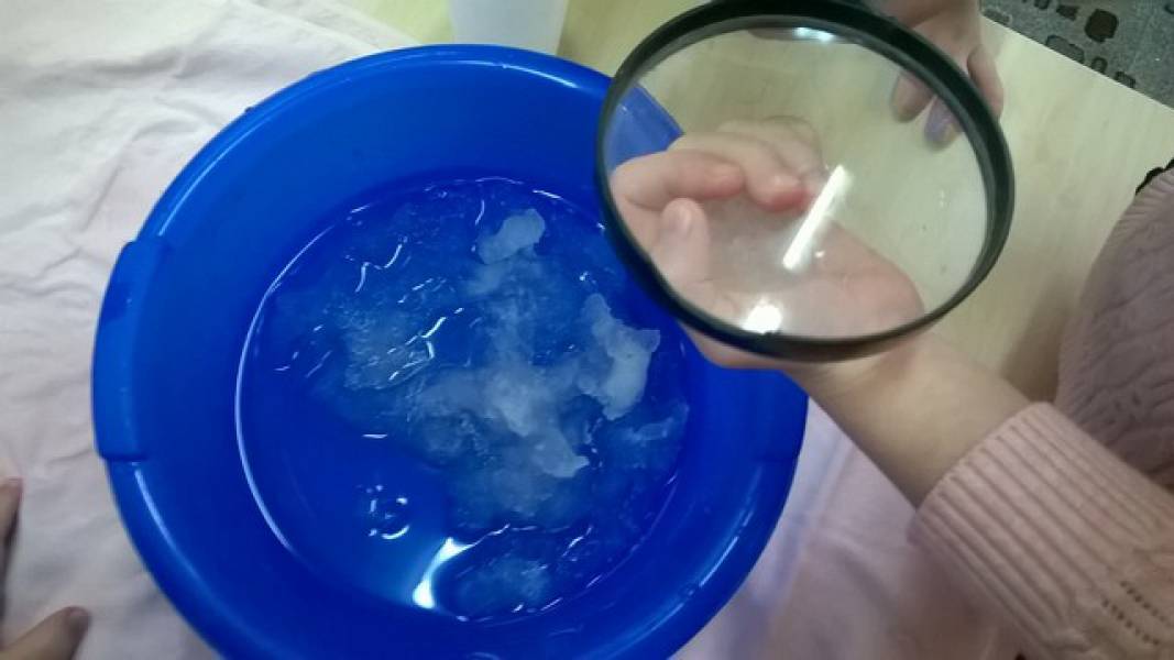 - «Пенное облако». В чашку с водой капнуть средства для посуды, размешать, подуть в трубочку для коктейля, появятся пузыри и характерный звук. Вывод: при попадании воздуха в мыльную воду образуется пена.