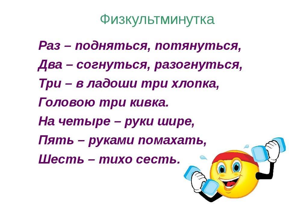 Отдых наш — физкультминутка.Занимай свои места:Раз — присели,Два — привстали.Руки кверху все подняли.Сели, встали, сели-встали,Ванькой-встанькойСловно стали.А потом пустились вскачь,Будто бы упругий мяч!