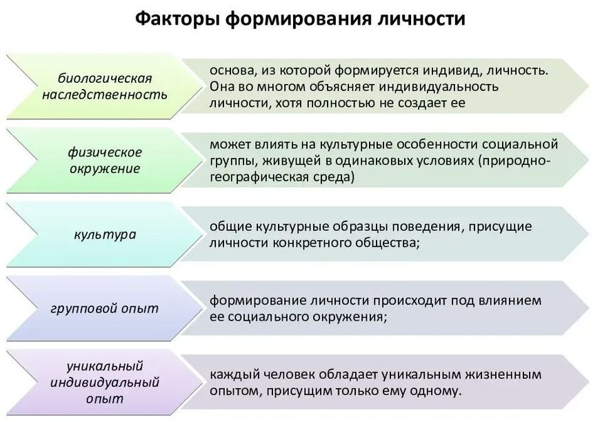 Личность человека формируется в процессе всей жизни под влиянием ряда факторов. Известно, что они не существуют по отдельности, т. е. без одного не может быть другого. Среди факторов развития личности выделяют: