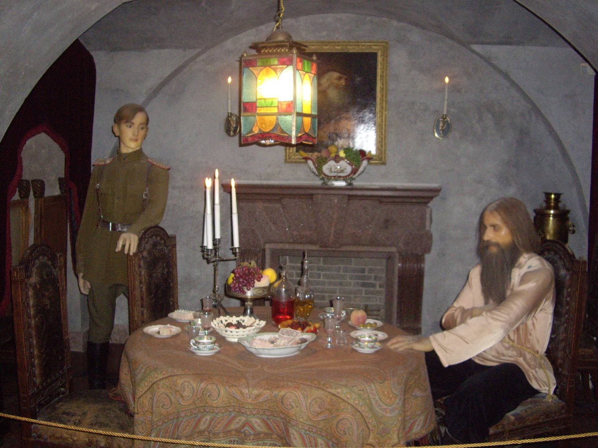 - Восковые фигуры Феликса Юсупова и Григория Распутина на месте убийства. Экспозиция во дворце Юсуповых на Мойке