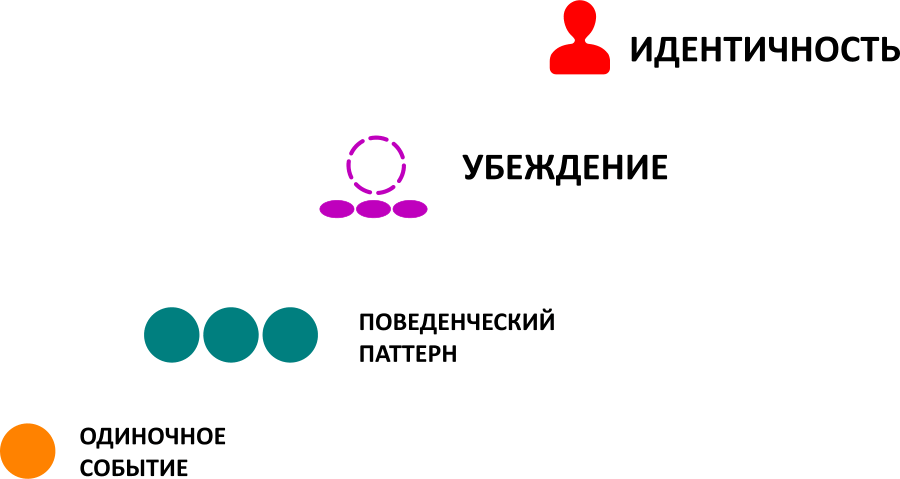 Отдельное событие заметить довольно просто. Установить поведенческий паттерн сложнее. Определить убеждение и идентичность ещё сложнее. Но при этом, чем на более высоком уровне обобщения происходит изменение, тем больший объём мы можем изменить.