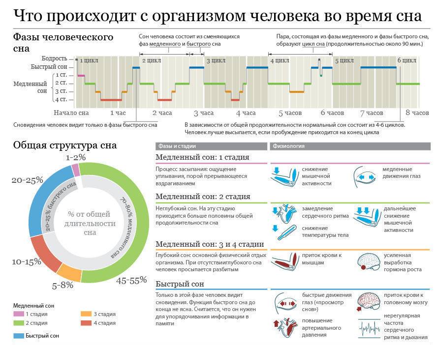 У любого человека сон делится на две фазы – быструю и медленную. Быстрые и медленные фазы чередуются между собой, составляя цикл сна. Каждый цикл равен примерно одному или полутора часам.