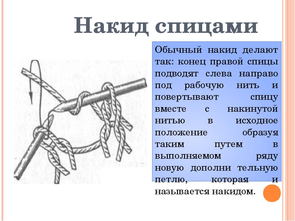 Еще одно немаловажное понятие-накид. Это воздушная петля. Создать его можно накинув раб.нить на спицу, так образуется прибавление