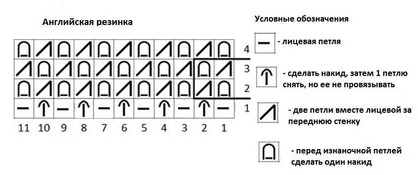 Вяжите английскую резинку по схеме, которую мы разместили. Разобраться в ней не очень сложно.