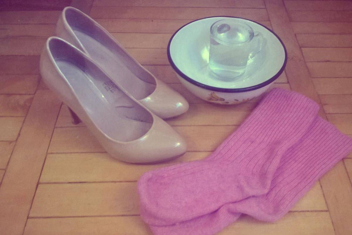 Обувь внутри нужно хорошо протереть уксусом и надеть ее на шерстяные носочки. Ходить так понадобится несколько часов.