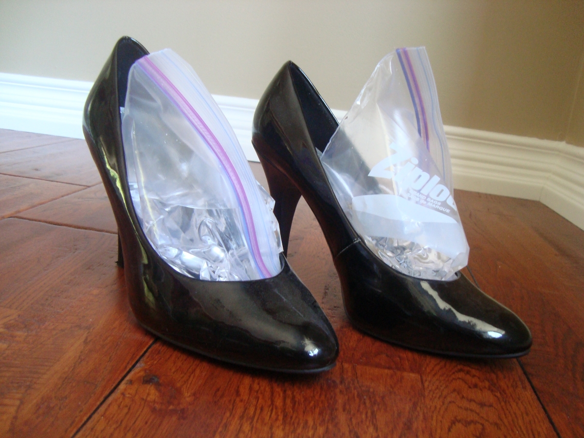 - Достаньте обувь, дождитесь, когда лёд растает, и достаньте пакеты. Примерьте пару.