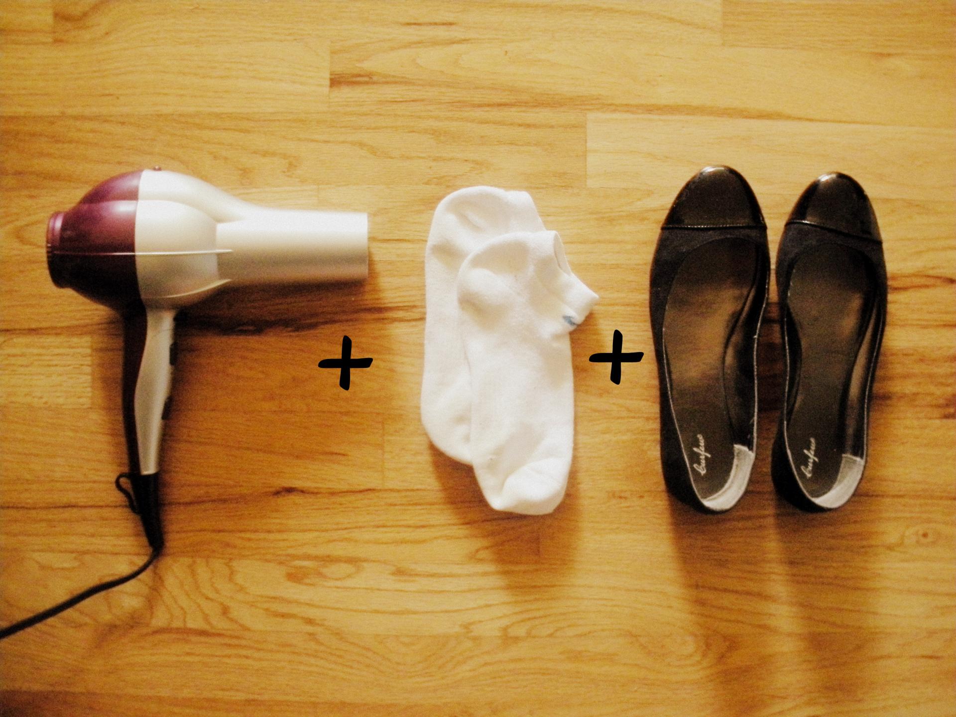 Эта методика подойдет для кожаных изделий. Вначале надевают носки, затем – обувь, далее с помощью фена обрабатывают горячим воздухом участок на изгибе стопы. Сразу снимать туфли не нужно – надо подождать, пока поверхность полностью остынет естественным путем. Так необходимо сделать 3-4 раза, потом внешнюю часть обработать ухаживающими средствами для обуви.