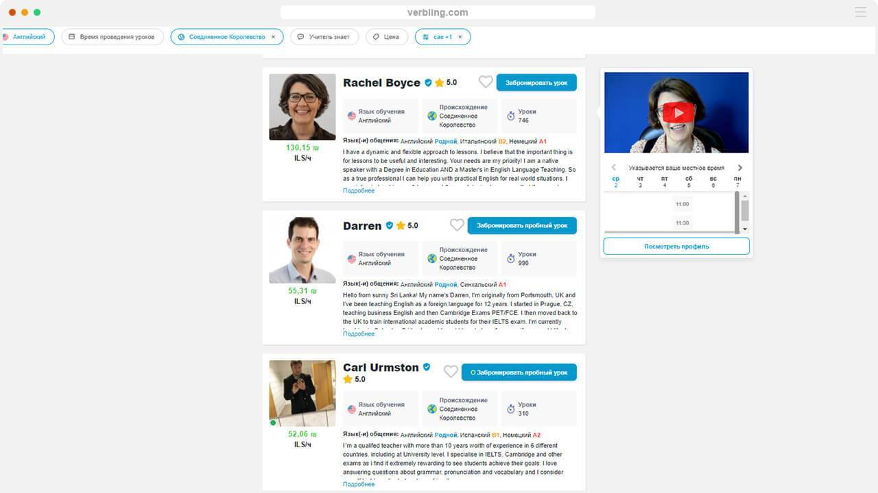 Выбирайте учителя по нужным параметрам: страна, время занятий, тематика курсов, стоимость обучения. Нажав на профиль, можно посмотреть видеопрезентацию и узнать об опыте преподавания