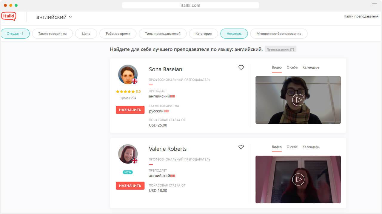 Учителя можно выбрать, используя фильтр: время уроков, стоимость занятий, родная страна, знание других языков. Например, вы можете изучать английский язык с французом или англичанином, который немного знаком с русским языком. Вариантов много.