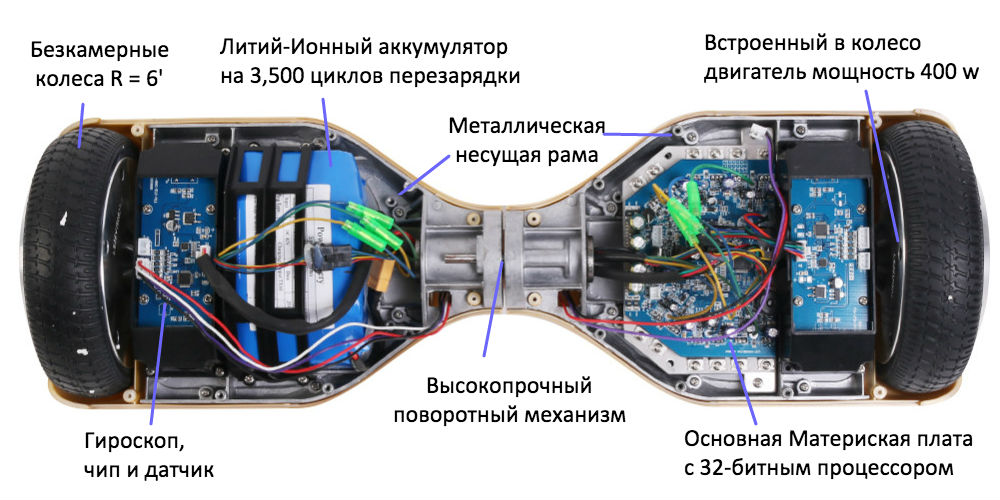 Существует несколько вариантов двухколесных самокатов без руля, но основными компонентами каждого из них являются два колеса, платформа для ног, батарея и система управления балансом.