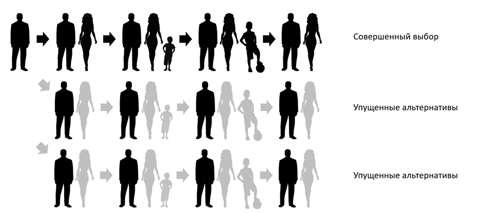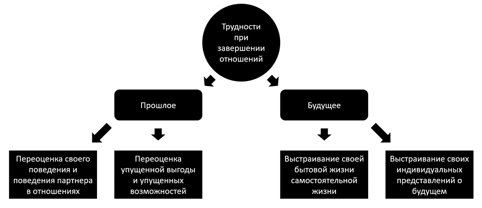 Упущенные выгоды/упущенные возможности. Хотим мы того или нет, но наши отношения связаны с сознательными ограничениями. Следовательно, выбирая их, мы отказываемся от некоторых альтернатив, которые трудно или вовсе невозможно сочетать с отношениями. Например, этими альтернативами могут быть: отношения с другими людьми, изменения в жизни (допустим, переезд), отказ от покупок или изменений тела (например, нанесение татуировки) и так далее. И когда отношения заканчиваются, человек может их обесценить, как и то время, которое в них провел. Механизм схож с тем, который описан выше. А на фоне обесцененного события – любая альтернатива имеет ценность. То есть, создается уже эмоциональный дискомфорт от потери, а потери люди переносят достаточно плохо (более подробно об этом можно узнать, ознакомившись с когнитивным искажением “неприятие потери”). А с учетом того, что мы склонны к идеализации того, с чем не взаимодействовали, то этот разрыв (а, следовательно, и сила дискомфорта) будут расти. И это тоже нужно будет принять. Если этот феномен кажется вам незнакомым, то попробуйте вспомнить, слышали ли вы от своих знакомых (или даже от себя) фразы, вроде: «Если бы я с ней не встречался, я бы согласился на ту работу с переездом в Москву», «Вот зачем я с ним сошлась? Был же Паша, который меня на руках готов был носить, а я с этим му…чудаком начала встречаться!» или «Я из-за неё бросил красить миньки Вархаммера, она говорила, что это ребячество, а у меня могла бы уже быть полная коллекция». Это еще одна задачка «из прошлого», решение которой нужно найти для перехода из диады в монаду без перспективы ловить флешбэки.С прошлым более или менее разобрались. Конечно, это всё грубыми крупными мазками, но для понимания пока достаточно. Теперь перейдем к будущему.