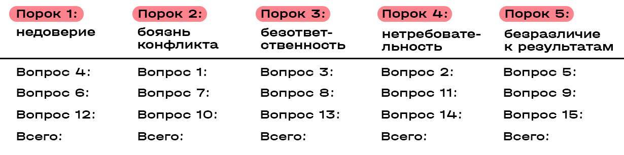 Важно: независимо от результатов, с каждой командой необходимо постоянно работать — без этого даже лучшие коллективы подвержены проблемам. Александра: «Патрик Ленсиони делит сложности команд на 5 блоков: