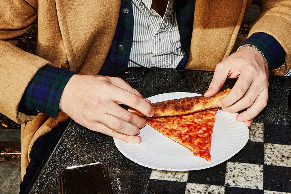 Классическая техника, которая подойдет в любой ситуации. Возьми кусок за корочку большим и средним пальцами. Указательным аккуратно надломи корочку сверху так, чтобы слайс прогнулся. Немного приподними уголки с широкого края, формируя треугольник. Так начинка останется на месте, а ты защитишь себя от капающего масла или соуса.