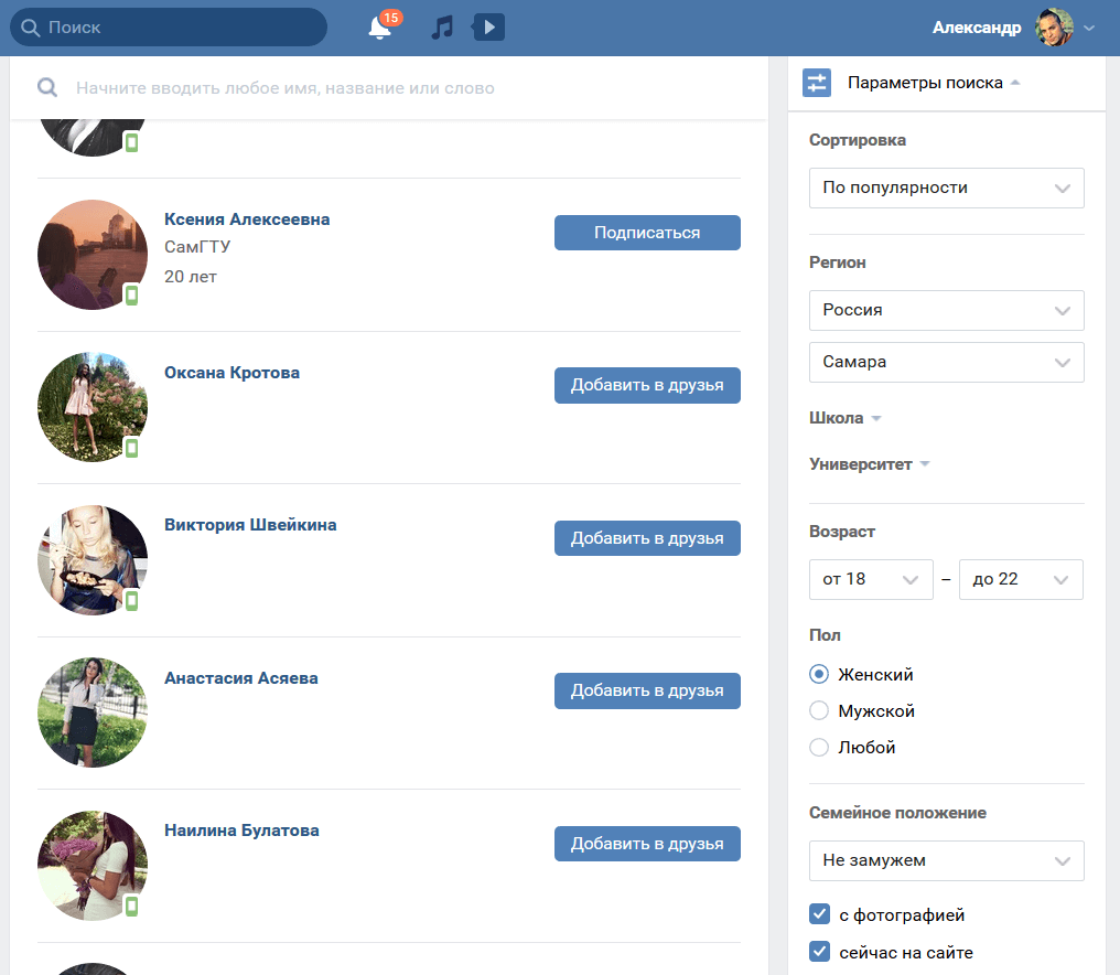 Не рекомендую искать девушек с семейным положением “В активном поиске”, как показала практика, эта категория девушек не подходит для нормального общения (много факторов: часто это фейки, девушки лёгкого поведения, эгоистки с завышенными требованиями, гордые барышни, окружённые излишним вниманием и т.д); Рекомендую знакомиться с девушками в ВК у которых немного друзей и подписчиков (настоящие, желанные дамы); Почитай: о чём поговорить с девушкой в ВК;