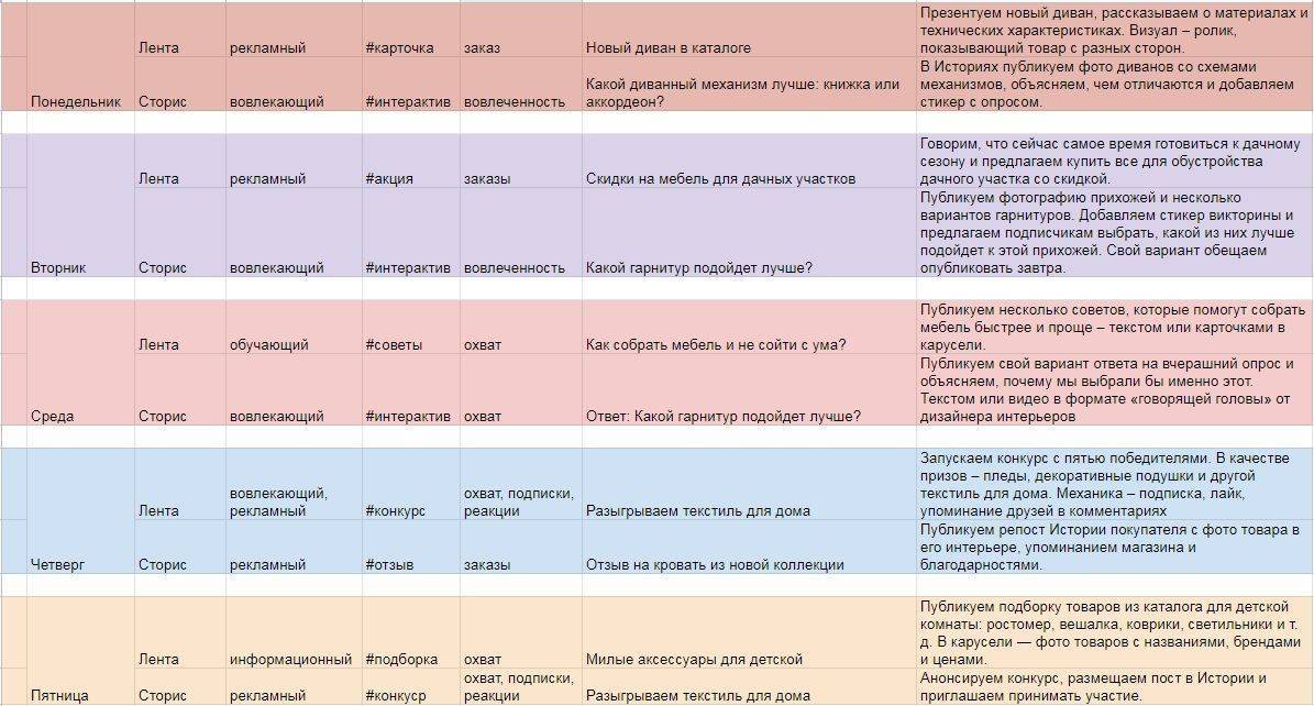 - таблицы по типу воронки, в которых тема из первой колонки будет эволюционировать по глубине из столбца в столбец – например, описание бренда в начале таблицы к концу станет постом о том, почему он первый в своей нише;