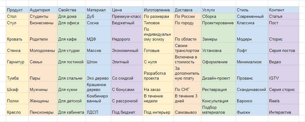 Может быть как в виде сложной многомерной схемы, так и в формате простой наглядной таблицы. В ее ячейках содержатся темы и ключевые фразы, а идеи для контента рождаются на пересечении ключей и категорий.