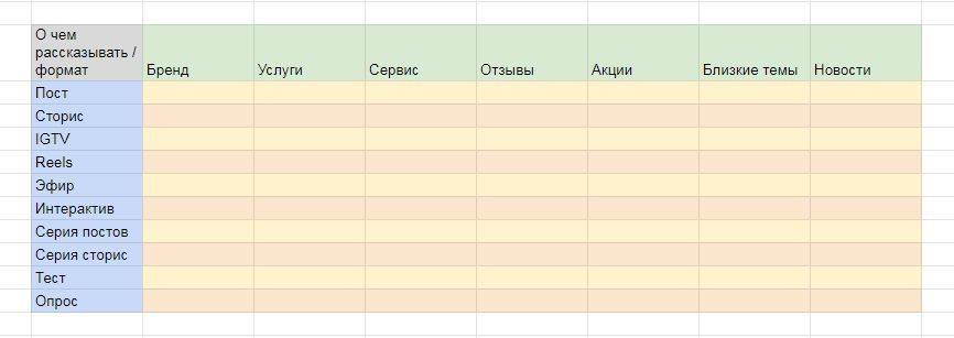 Документ в Гугл Таблицах или схема на ватмане – разные форматы одной и той же матрицы контента для соцсетей. Она может быть в виде: