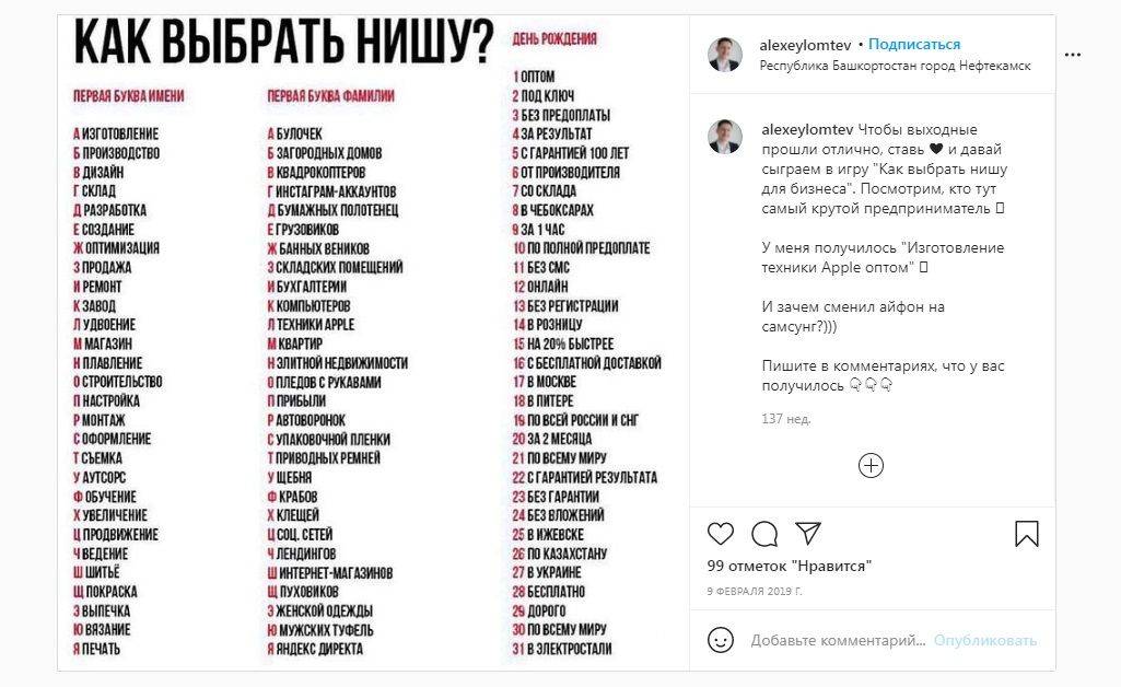 Например, матрица контента для Инстаграма* может состоять из столбцов с параметрами, сочетая которые, получаем готовые темы для публикаций (но не заголовки – над ними все-таки надо еще подумать). Самый наглядный пример – шуточные матрицы в соцсетях, с помощью которых подписчикам предлагают определиться с занятием на выходные / индейским вариантом своего имени / сферой бизнеса – тот случай, когда сама матрица стала контентом.