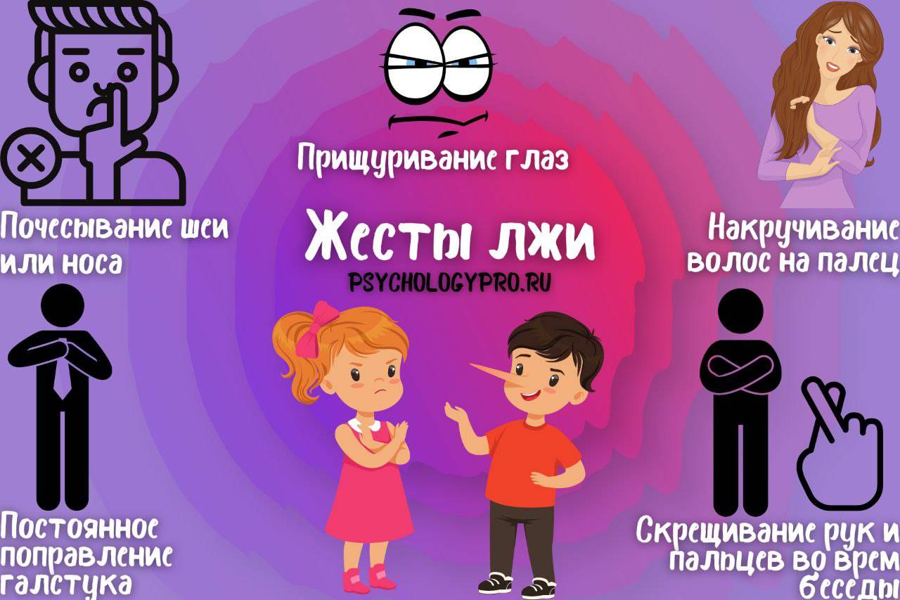 Выучите жесты, которые чаще всего делают те, кто говорит неправду: человек трёт глаза, прикрывает рот, чешет нос, касается лица руками, часто оттягивает воротник рубахи.