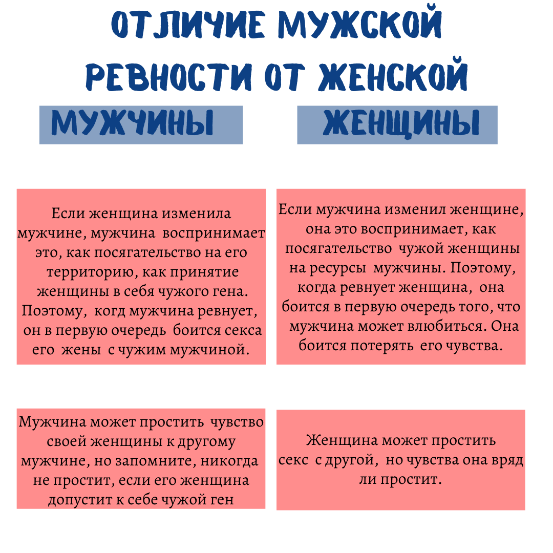 У мужчин ревность другая. Мужчина боится, что его женщина может занять сексом с другим. Мужчина боится за постель, за секс. Тем более, что он не знает, что там может вытворять другой самец с его “собственностью”, а вдруг он умеет лучше? а вдруг там больше? а вдруг чаще? Т.е. вся мужская ревность сводится не к эмоциям, а к не допустить потенциально-лучшего мужчину добраться до его женщины.⠀