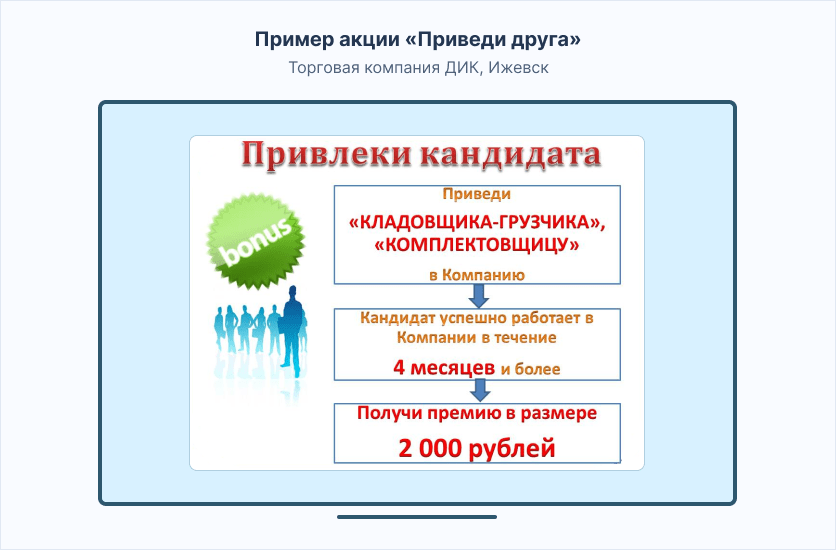 Нередко в компаниях проводятся акции «приведи друга». По сути, это реферальная программа, когда работающим сотрудникам предлагают премии за то, что они приведут в команду своего знакомого. Однако получить вознаграждение удастся только после того, как привлеченный кандидат отработает испытательный срок.
