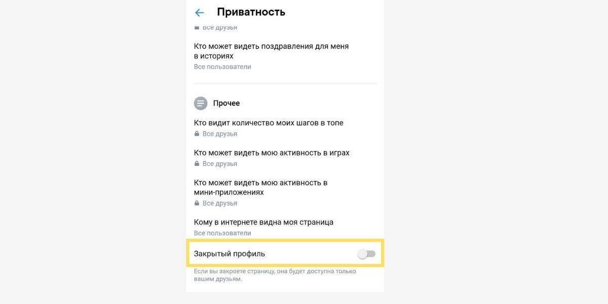 Закройте профиль. Для этого отмотайте в самый низ до раздела «Прочее» и нажмите на тумблер «Закрытый профиль».