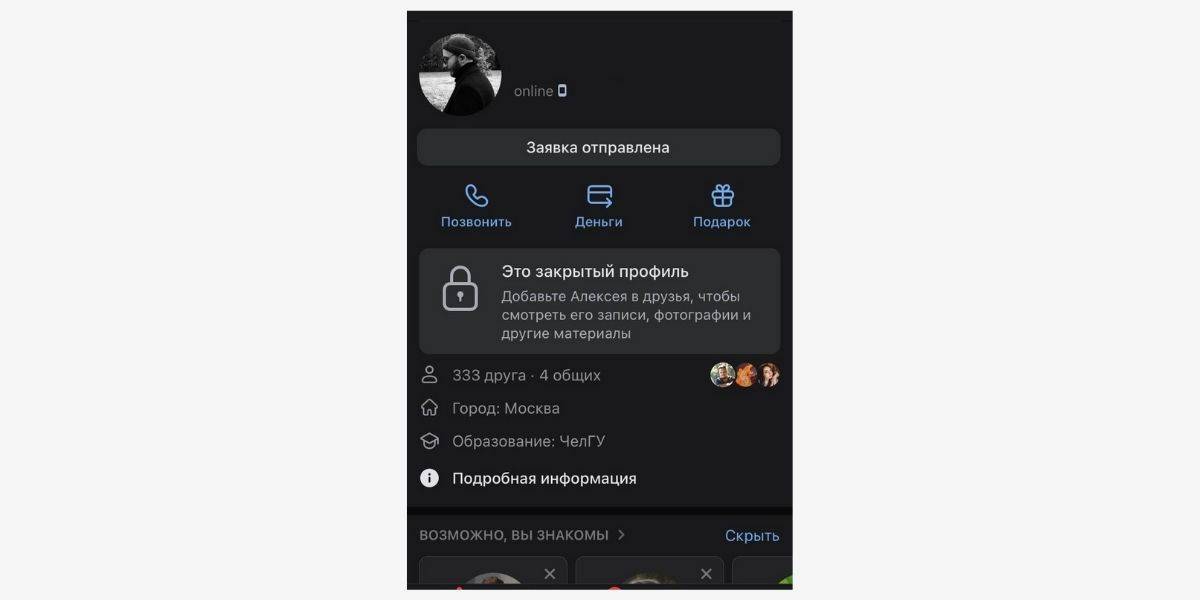 Ещё один вариант — попросить помощи у человека, который в друзьях у владельца скрытого профиля. Посредник может найти и переслать вам нужную информацию. Единственная сложность — придётся объяснять, зачем она вам. Этот вариант сработает, если человек, к которому вы обратились, заслуживает доверия. Если же нет, есть риск, что он передаст вашу просьбу владельцу страницы.