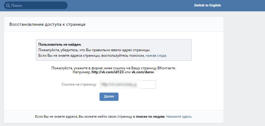 - Заметьте, что ссылку обязательно нужно вводить в корректном формате (https://vk.con/пользователь) – если вы не помните адреса страницы, перейдите на поиск во Вконтакте, нажав на соответствующую ссылку внизу основного окна;