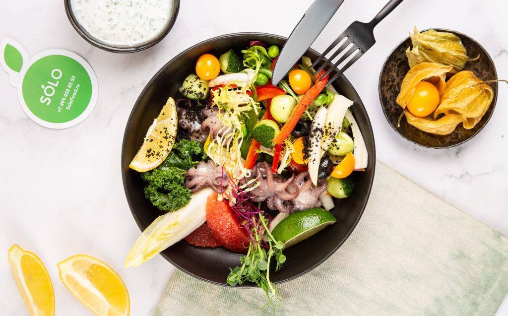 Салат из мини-осьминогов, цикория, огурца и перца рамиро, с землей из маслин и огуречным соусом в программе сбалансированного питания Solo Daily
