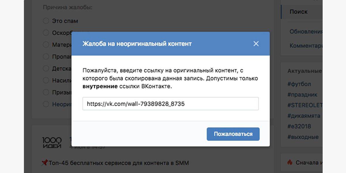 Дальше я поступаю так, как советует «Немезида» ВК: кликаю на кнопку «Пожаловаться» в правом верхнем углу поста и затем выбираю самый нижний пункт – «Неоригинальный контент». Затем я ставлю ссылку на первоисточник.
