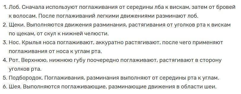 Начать массаж следует с нежных поглаживаний со стороны плечевого пояса, потом поднимаемся к лицу. Выполняем легкие поглаживания от бровной части к волосам. Опускаемся к челюстной части, проходим по жевательным мышцам. Укрепляем лицевую мускулатуру за счет поглаживаний, разминаний, растираний.