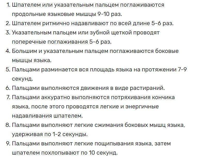 Все движения выполняются по трем направлениям: по вертикали, горизонтали и поперек. При отклонении языка в сторону следует осуществлять упор на сторону его отклонения. После каждой манипуляции ребенку нужно давать время для заглатывания слюны.