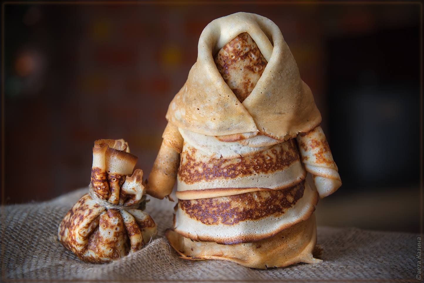 Отличным украшением и лакомством любой ярмарки являются поделки из настоящих блинов. Обычно из них делают куколки или домики.