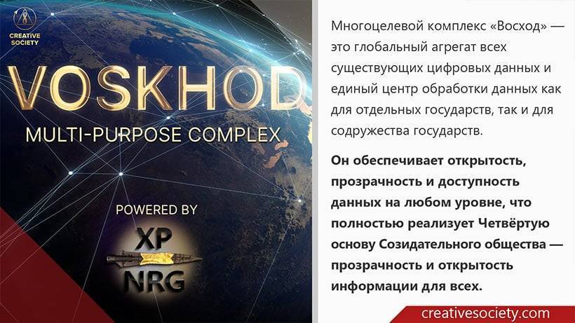 Многоцелевой комплекс «Восход» — это глобальный агрегат всех существующих цифровых данных и единый центр обработки данных как для отдельных государств, так и для содружества государств. Он обеспечивает открытость, прозрачность и доступность данных на любом уровне, что полностью реализует Четвёртую основу Созидательного общества — прозрачность и открытость информации для всех.
