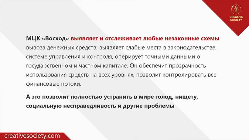МЦК «Восход» выявляет и отслеживает любые незаконные схемы вывоза денежных средств, выявляет слабые места в законодательстве, системе управления и контроля, оперирует точными данными о государственном и частном капитале. Он обеспечит прозрачность использования средств на всех уровнях, позволит контролировать все финансовые потоки. А это позволит полностью устранить в мире голод, нищету, социальную несправедливость и другие проблемы потребительского формата при переходе на созидательный формат.