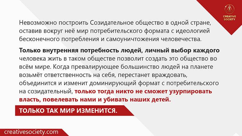Также невозможно построить Созидательное общество в одной стране, оставив вокруг неё мир потребительского формата с идеологией бесконечного потребления и самоуничтожения человечества. Только внутренняя потребность людей, личный выбор каждого человека жить в таком обществе позволит создать это общество во всём мире. Когда превалирующее большинство людей на планете возьмёт ответственность на себя, перестанет враждовать, объединится и изменит доминирующий формат с потребительского на созидательный, только тогда никто не сможет узурпировать власть, повелевать нами и убивать наших детей. Только так мир изменится.